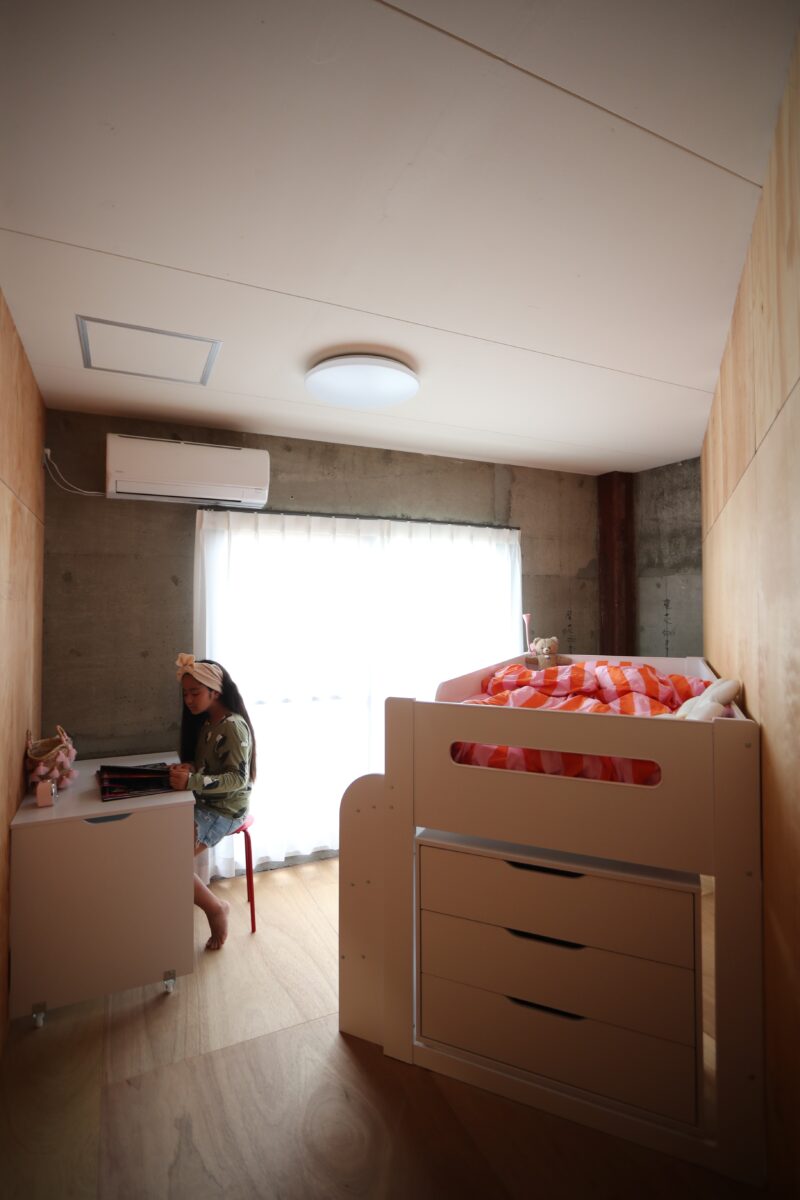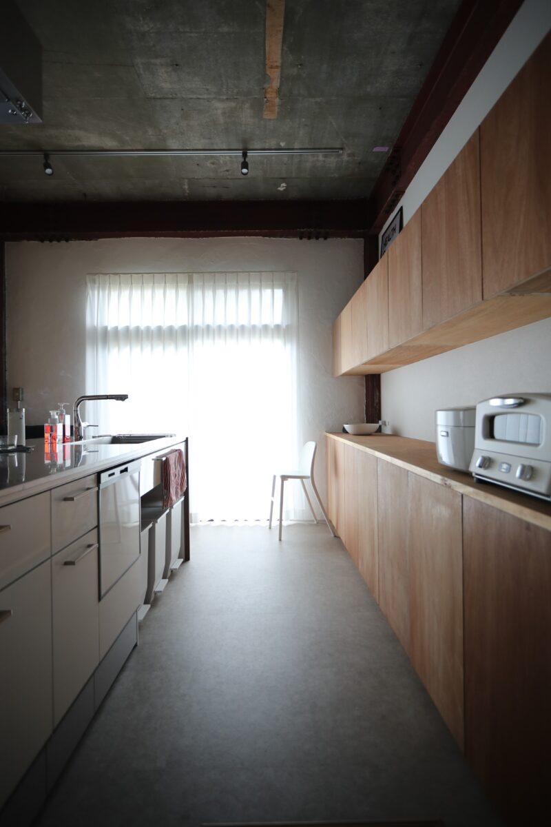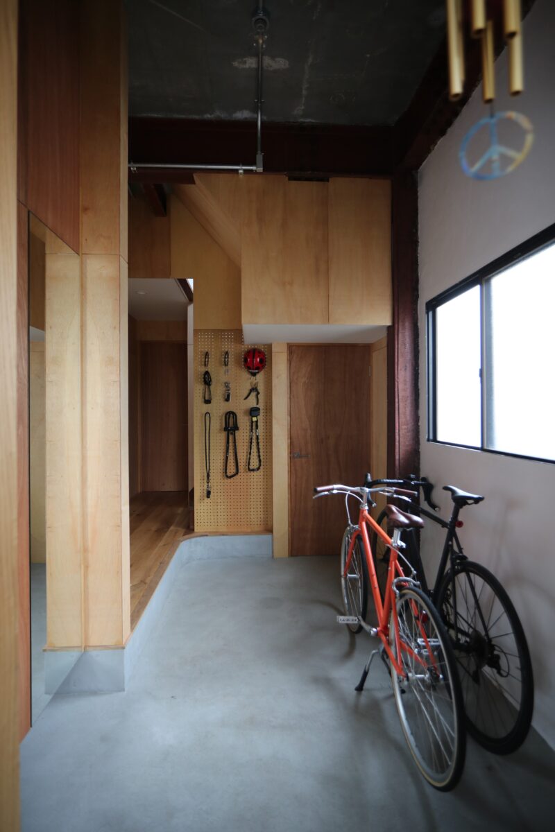 築45年の鉄骨と鉄筋コンクリートの混構造3階建て住宅のリノベ工事である。内装を解体して出てきたのは鉄筋コンクリートの壁とスラブ、そして錆止め塗装の重量鉄骨の柱と梁。これらを全て綺麗な仕上げ材で覆う選択も有ったが、このままがかっこいいと言うお客様。なので無駄な装飾はせず、極力シンプルに仕上げた。コンクリートと鉄骨はそのまま表しとし、新たに作った壁は針葉樹合板仕上げとした。