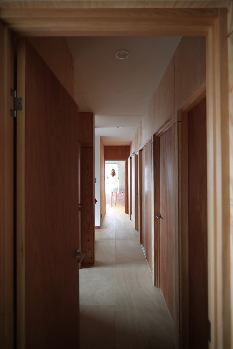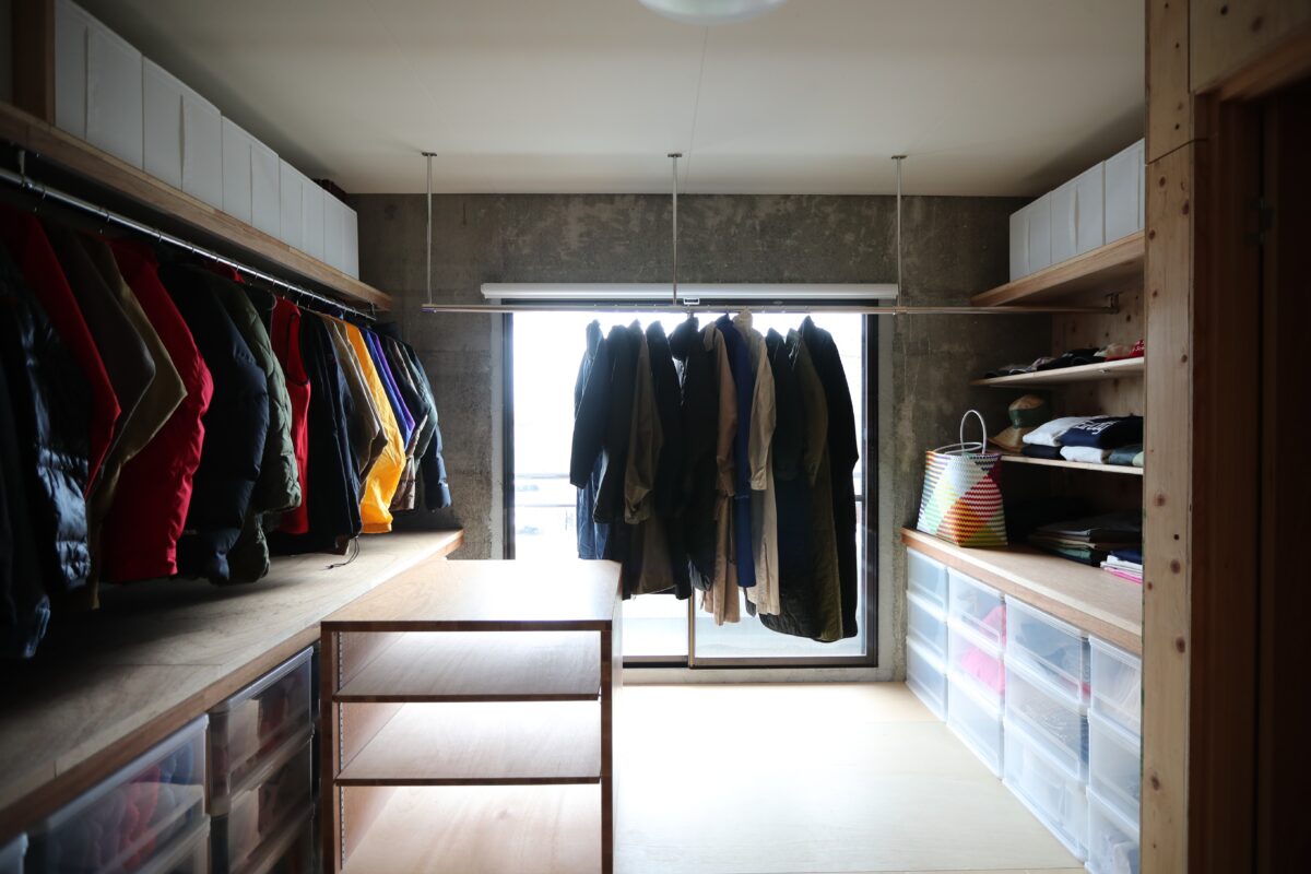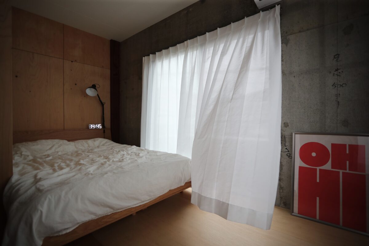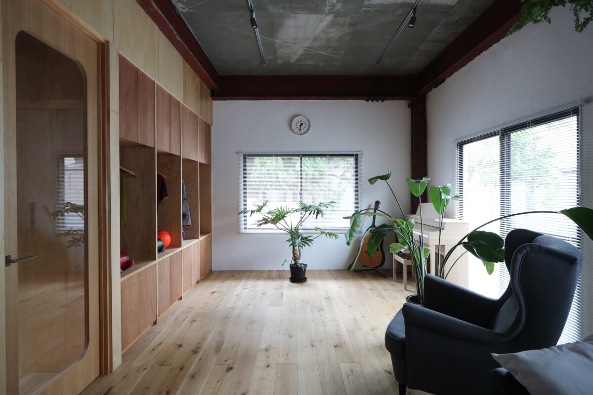 築45年の鉄骨と鉄筋コンクリートの混構造3階建て住宅のリノベ工事である。内装を解体して出てきたのは鉄筋コンクリートの壁とスラブ、そして錆止め塗装の重量鉄骨の柱と梁。これらを全て綺麗な仕上げ材で覆う選択も有ったが、このままがかっこいいと言うお客様。なので無駄な装飾はせず、極力シンプルに仕上げた。コンクリートと鉄骨はそのまま表しとし、新たに作った壁は針葉樹合板仕上げとした。