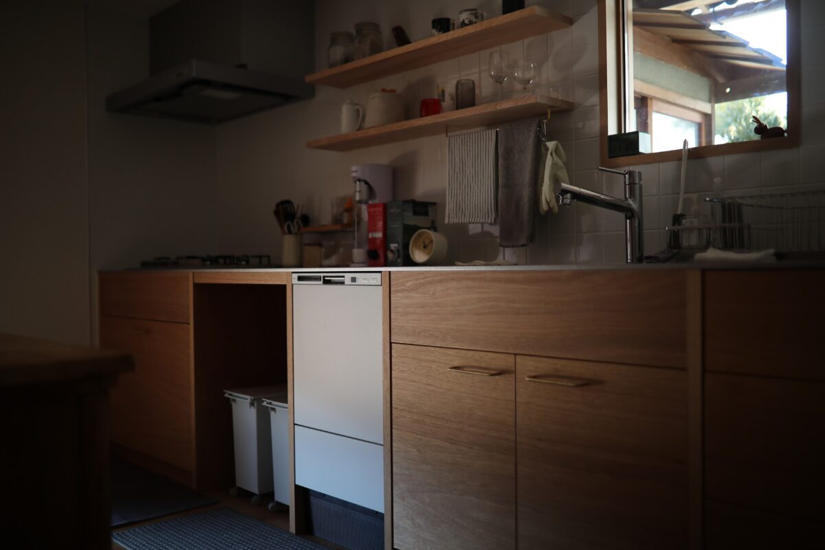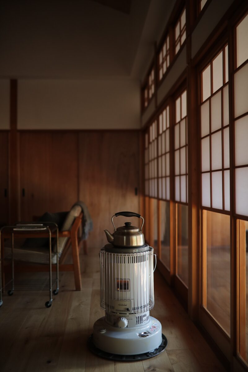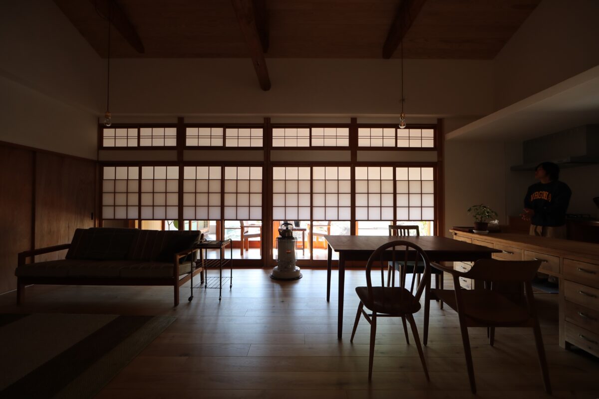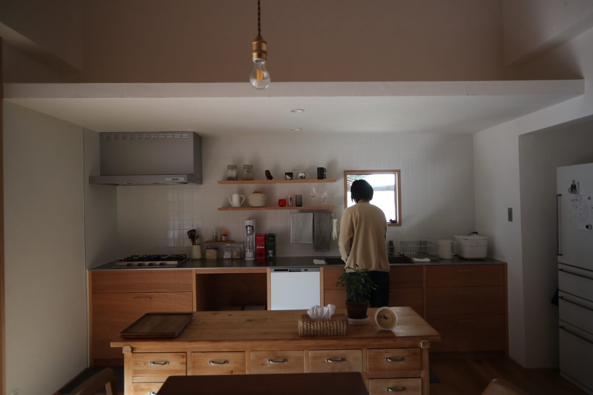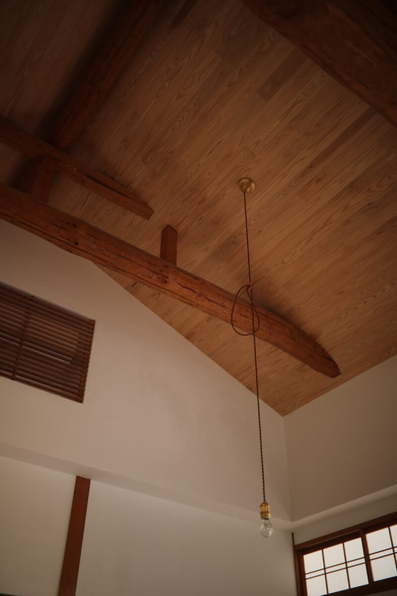 築48年の木造平屋建て住宅のリノベ工事である。初めてこの建物を見た印象は立派な材木と腕の良い大工さんによって建てられた家だった。先人の仕事を無駄にしない様心掛けた。2間続きの和室の天井を取ると3重の丸太梁が現れた。それが見える様に屋根裏に断熱材を入れ杉板を張り、壁は漆喰塗りとした。あとは水回りを現代の生活に合う様に改修したが、出来るだけ元の家の形を残す様に工事した。